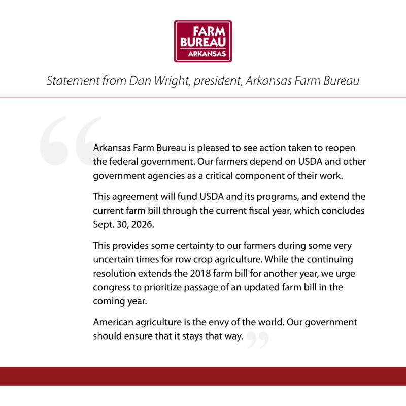 Arkansas Farm Bureau appreciates the action to reopen the federal government. This provides much-needed certainty for our farmers and reinforces the essential role of USDA programs in supporting American agriculture.